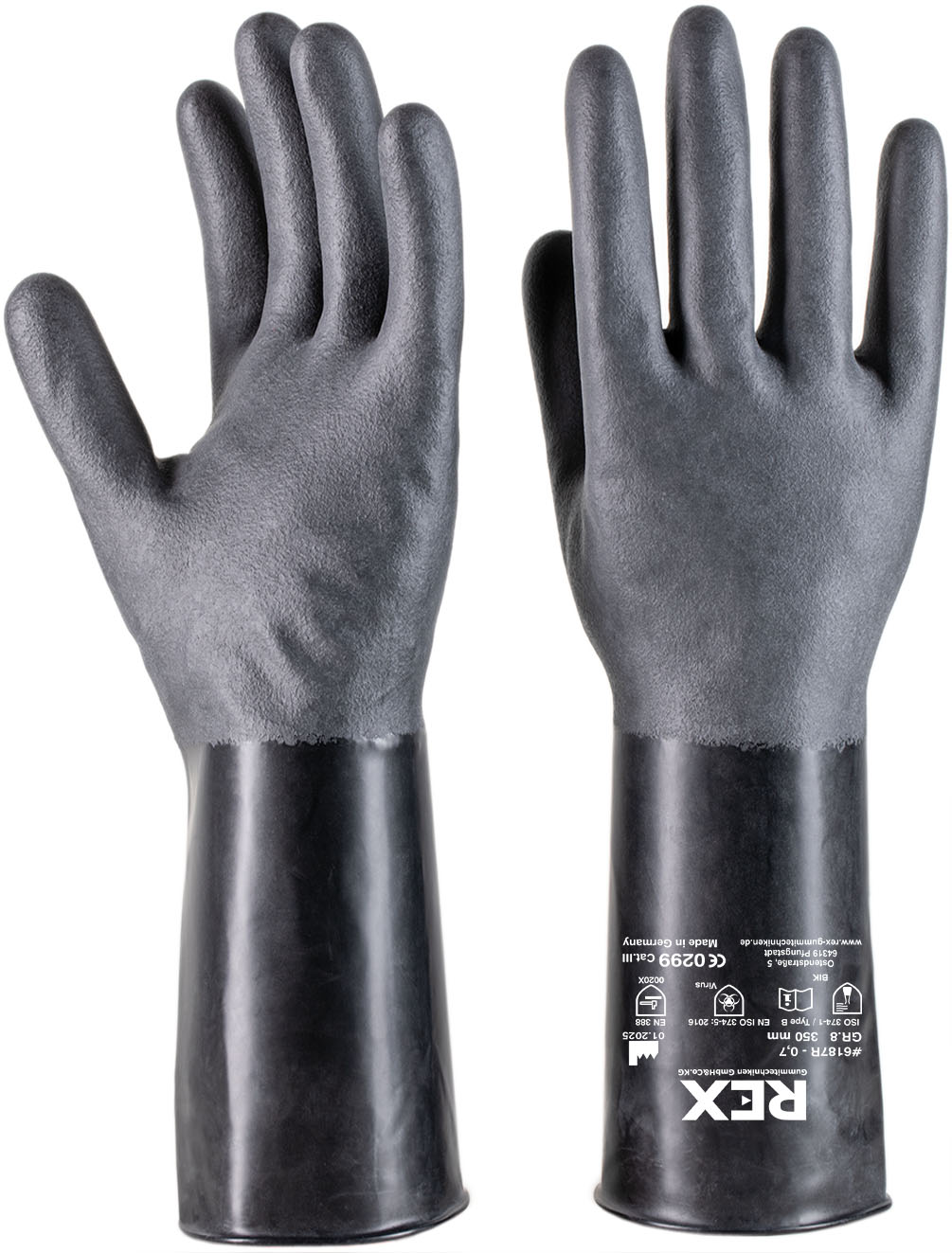 Chemikalien Schutzhandschuh aus Butyl-Kautschuk, zum Einsatz bei sehr hoher Beanspruchung durch Ester, Ketone, Gase, Abgase und spezielle Chemikalien.